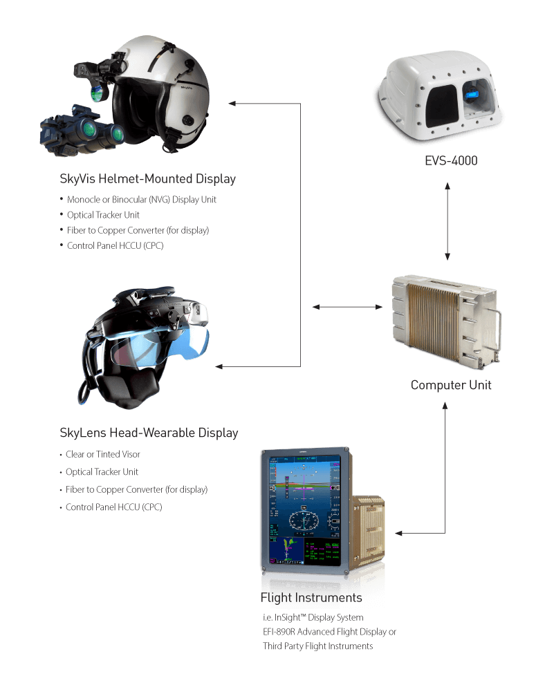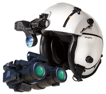 SkyVis uses a helmet-mounted, monochrome, monocular display, which augments the operator’s vision with HUD symbology, as well as optional SVS, EVS-4000, or CVS imagery. The display module does not require helmet modification and mounts directly to existing NVG mounting hardware. The SkyVis NVG option also mounts to the helmet’s existing mounting hardware and provides NVG compatible display symbology.