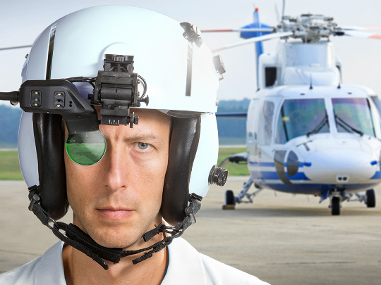 SkyLens uses a head-harnessed, monochrome, visor display, augmenting the operator’s vision with HUD symbology, as well as optional SVS, EVS-4000, or CVS imagery. SkyLens’ design allows operators to wear prescription eyeglasses and to use a standard aviation headset.