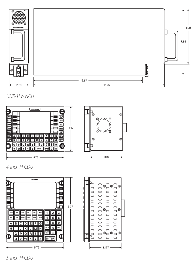 Display and user control is provided through the 4-inch or 5-inch FPCDU. A Multi-functional Control Display Unit (MCDU) is specially tailored for airline or special mission operations. Universal’s FPCDUs feature graphics capabilities and incorporate the latest technology in Active Matrix Liquid Crystal color Displays (AMLCD). They feature the highest contrast, lowest reflection and greatest horizontal and vertical viewing angles available, and offer superb sunlight readability. Unique parallax control is also provided. The system uses two character sizes and line graphics to enhance data recognition.